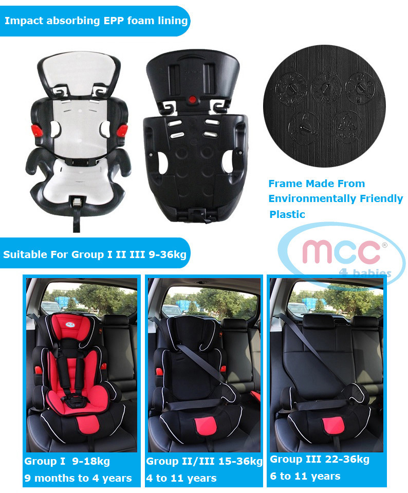- Group 1-2-3. Suitable for children from 9 months to 11 years (9kg to 36kg).