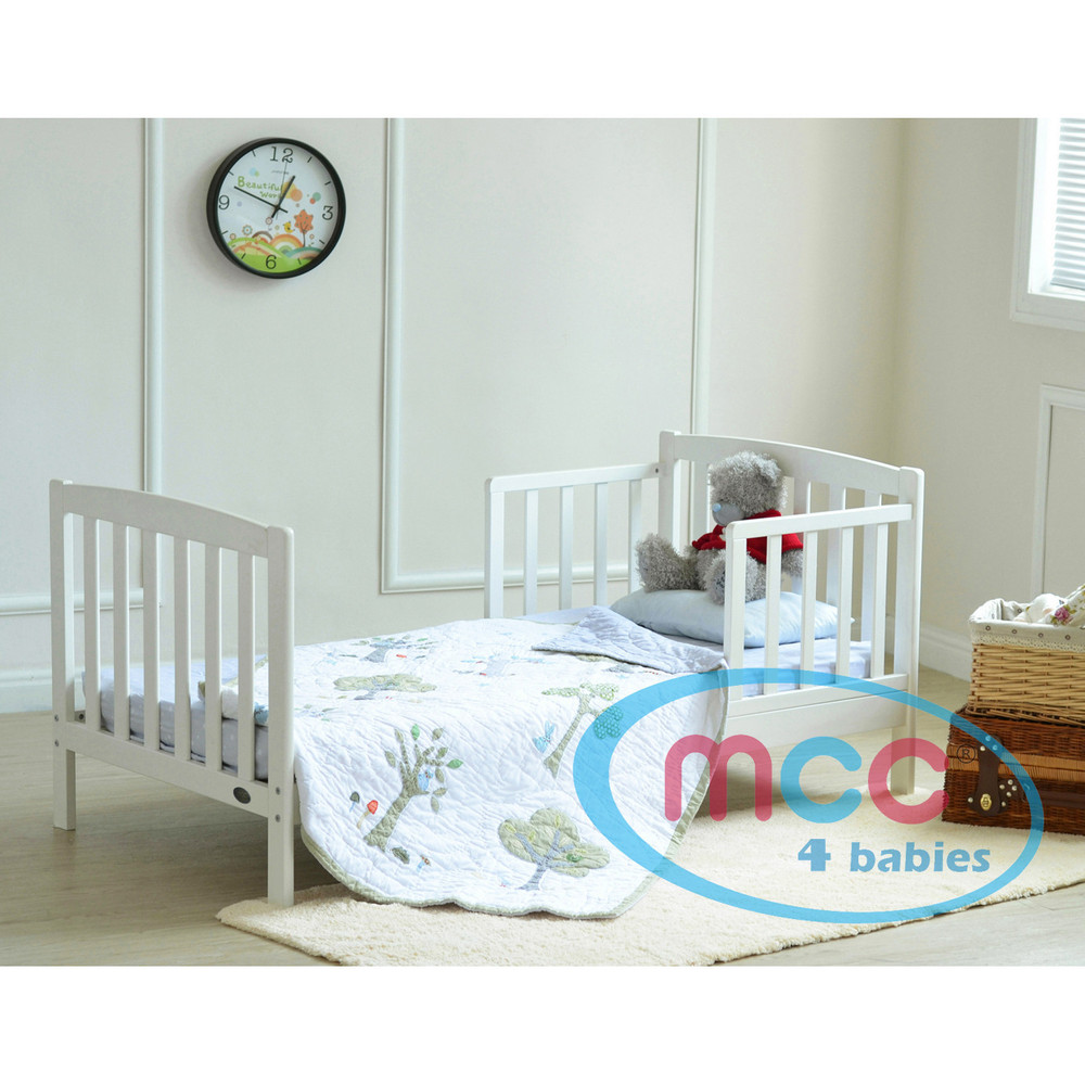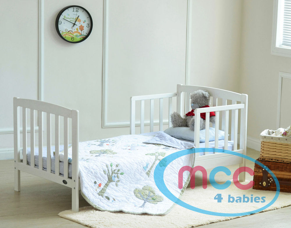 This toddler bed is tastefully designed to emphasise simple horizontal and vertical lines and flat panels. Designed low to the floor for your toddler's ease of getting in and out of bed bed and the sturdy solid timber construction is sure to withstand even the most rambunctious toddler, featuring two removable safety guard rails and a beautiful non-toxic finish. The perfect transition for toddlers who have outgrown their cribs but are still too small for an adult bed.